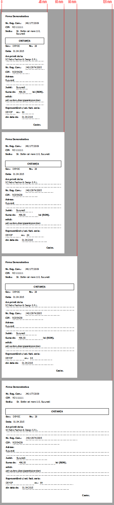 Mai jos găsiți exemple de formatare a documentelor fiscale pentru imprimante termice cu dimensiunea rolei de hârtie de 45 mm / 65 mm / 80 mm / 120 mm. Programul nu este limitat la dimensiunile din exemple, ci este compatibil cu orice rolă de hârtie cu lățimea între 45 mm și 120 mm și margini de printare diferite în funcție de imprimantă. Dispuneți de 76 de trepte milimetrice de redimesionare. Cele mai uzuale lățimi sunt de 58 mm, 80 mm si 112 mm. Se poate observa ajustarea automata a câmpurilor în funcție de suprafața disponibila.