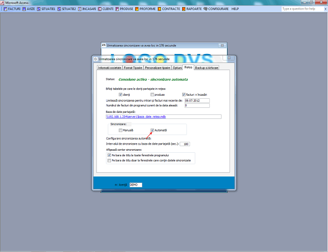 Va trebui să stabiliți intervalul de sincronizare: timpul dintre două sincronizări succesive efectuate după criteriile definite în fereastra de configurare rețea. Sincronizarea durează în funcție de volumul datelor ce urmează a fi sincronizate și de viteza de funcționare a rețelei. De aceea recomandăm un timp de sincronizare adecvat cu numărul de stații conectate la baza de date partajată, cu viteza conexiunii la server și performanțele serverului (pentru 3 - 5 stații de facturare recomandăm minim 180 de secunde).