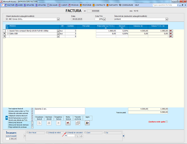 Dacă alegeți "Chitanță de calculator" înseamă că doriți să emiteți chitanța cu ajutorul programului. Numărul de chitanță va fi generat automat după completarea facturii și bifarea controlului "Factura este gata". Butoanele de vizualizare și tipărire a chitanței vor deveni active.