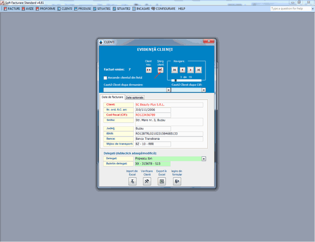 Pentru a sterge un client din baza de date, selectati clientul apoi apasati "Sterg înregistrarea". Datele clientului vor fi sterse, operatie ireversibila. Daca clientul are facturi emise, atunci veti primi un mesaj de avertizare. Daca acceptati, clientul, va ramâne înregistrat doar în situatii cu numele si codul fiscal.
